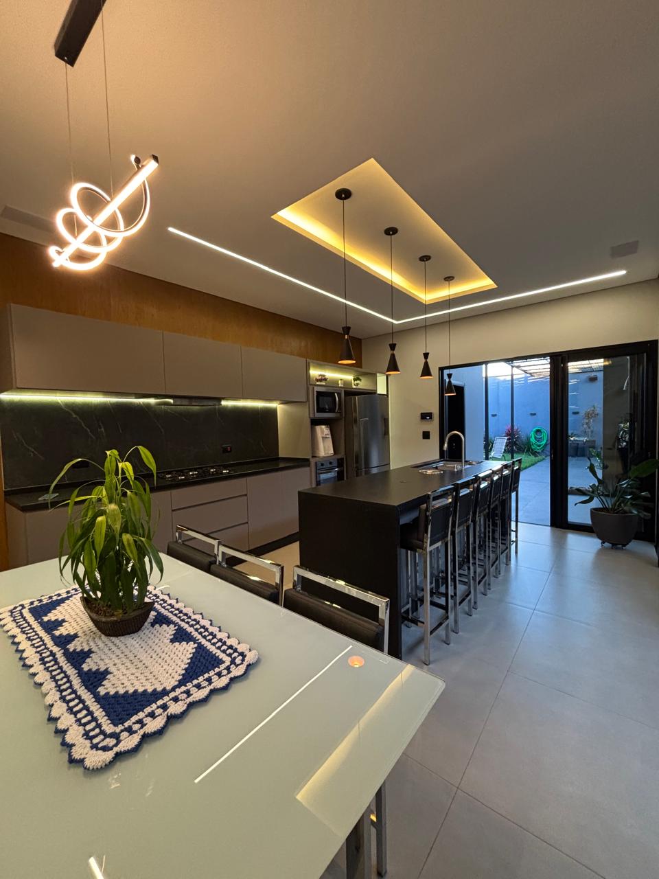 cozinha com moveis planejados, banquete e mesa,